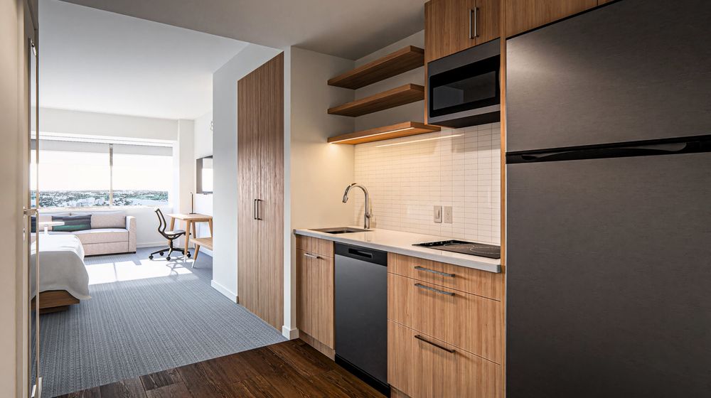 This new six-storey hotel is located in the Airport District in Calgary, Alberta and offers 100 family-oriented rooms with features such as meeting rooms, fitness rooms, breakfast areas, and a swimming pool with waterslides.